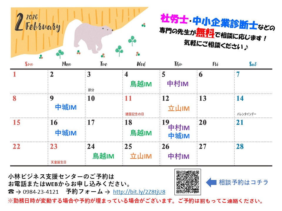 【2月】小林ビジネス支援センター出勤日のお知らせ
