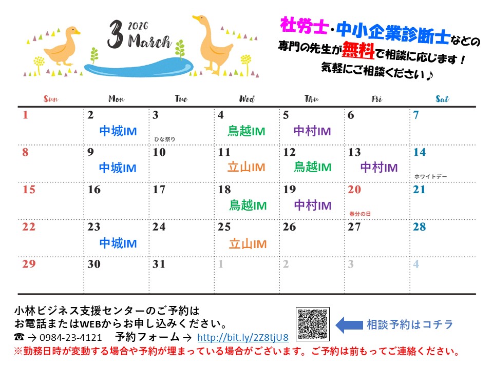 【3月】小林ビジネス支援センター出勤日のお知らせ